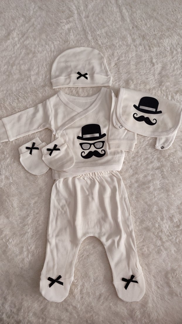 Bu açık beyaz bebek seti Şapka, önlük, eldiven ve fiyonk detaylı pantolonla rahat şıklık sunar. marka temsilidir