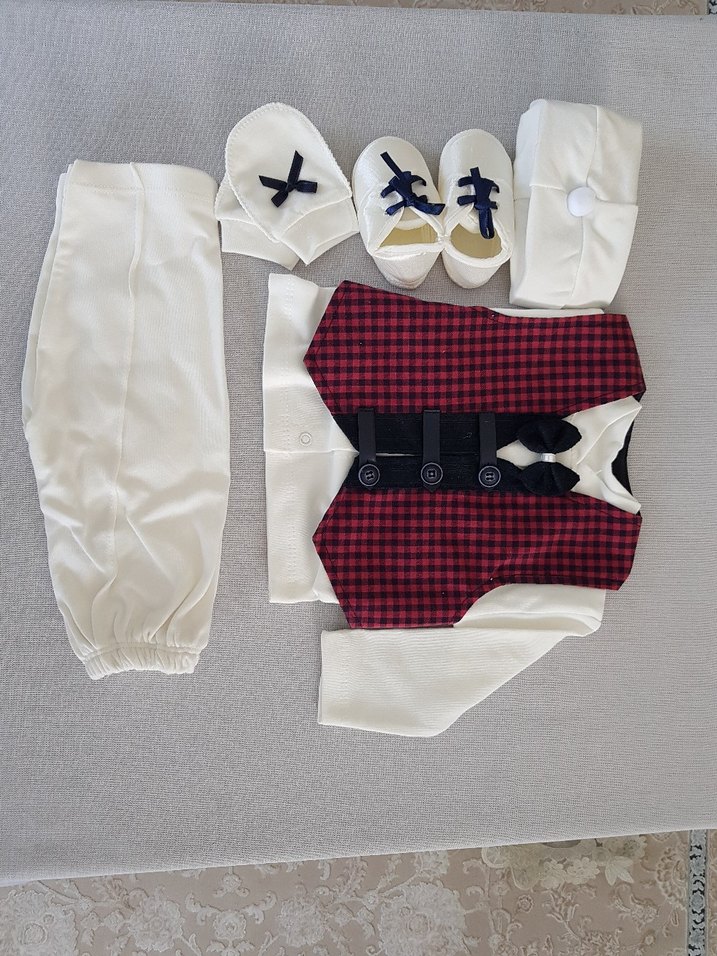 Kolsuz Yelek Papyonlu Uzun kollu body Beyaz pantolon Şapka Eldiven Ayakkabı içerir. 5 parçadan oluşuyor. 0-6 aylık.