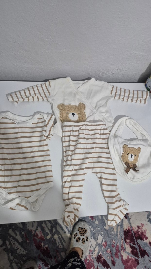 Beyaz triko uzun kollu üstü ayı detaylı, çizgili pantolon, çizgili body ve uyumlu önlükten oluşan erkek bebek 4'lü takımı. Rahat ve şık.
