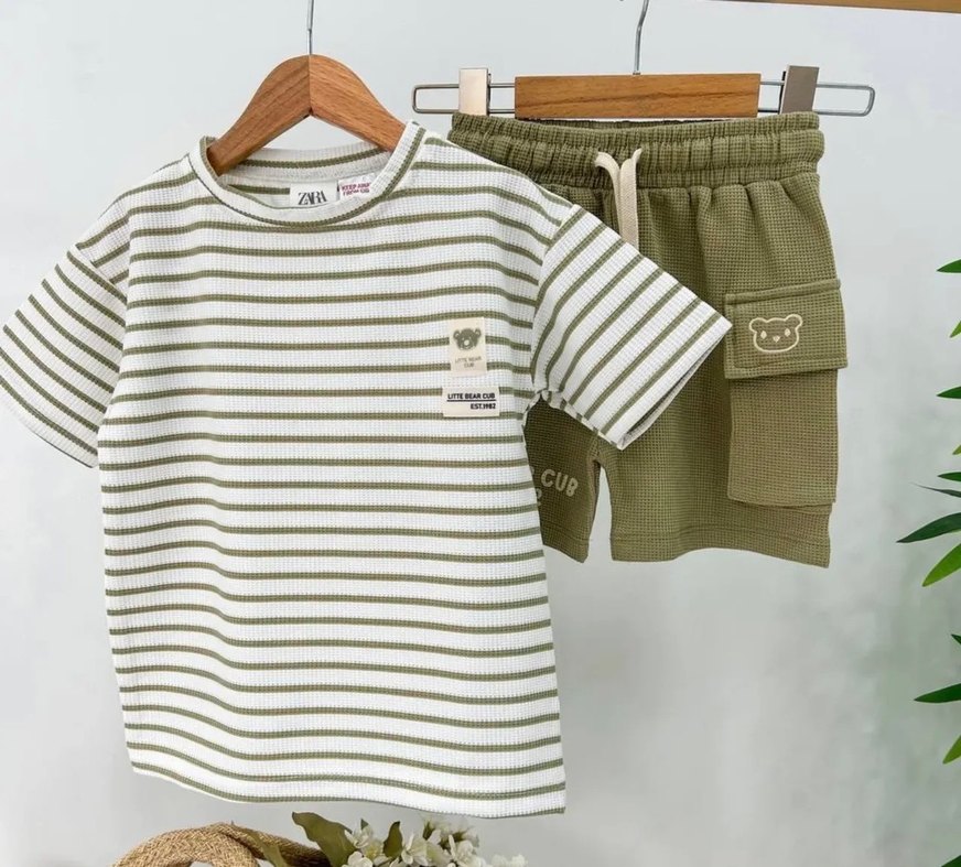 Erkek bebek için kısa kollu pamuklu çizgili tişört ve baskılı ayı detayı ile khaki şort takımı. Rahat ve günlük tarzda. 2-3 yaş,3-4 yaş,7-8 yaş Lütfen istediğiniz yaşı belirtiniz