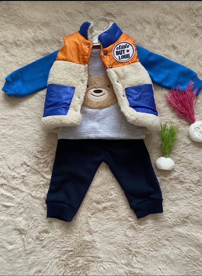 Erkek bebek için çok renkli, street wear tarzında, kürk detaylı yelek, uzun kollu baskılı bisiklet yaka üst ve siyah pantolon takımı. 6-9 ayı mevcuttur