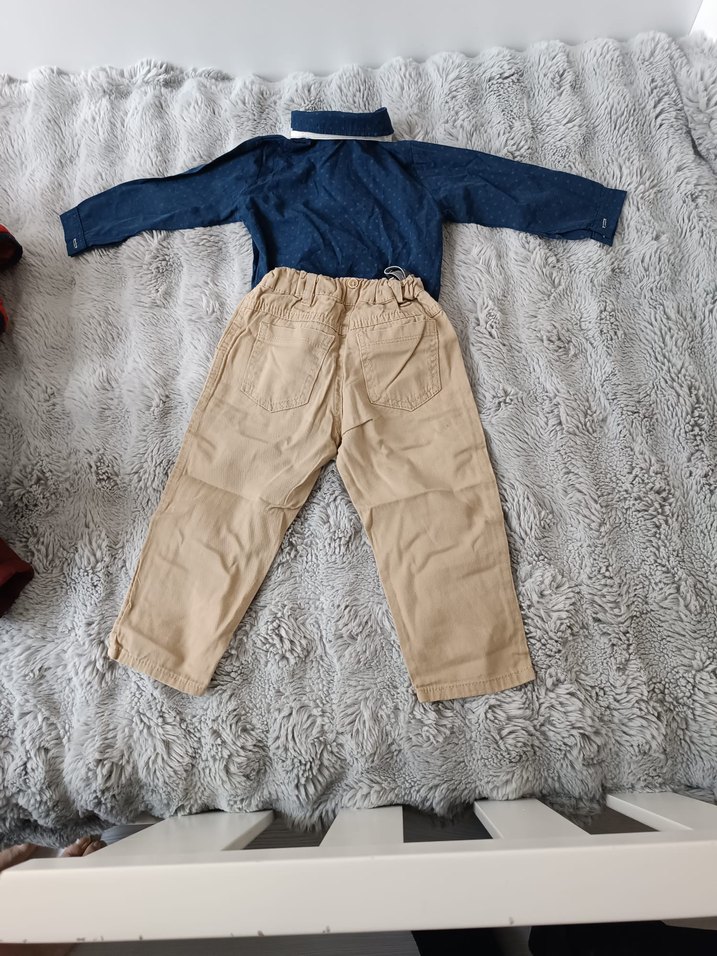 Uzun kollu düğmeli denim gömlek ve kahverengi elastik bel pantolon içeren erkek bebek kıyafet seti. Rahat ve sade tasarım.