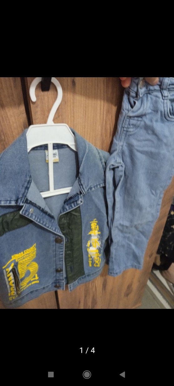 Gri baskılı, düğmeli, yaka detaylı denim ceket ve mavi pantolonlu erkek bebek takımı. Uzun kollu, sokak stili.