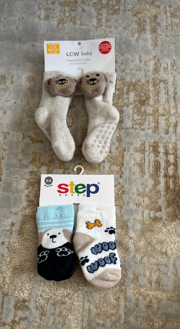 Gri ve kahverengi tonlarında, desenli erkek bebek çorapları. LCW baby ayıcık figürlü ve Step renkli hayvan desenli modeller içerir. Üstteki6-12 ay zilli çorap Alttaki 0-6ay