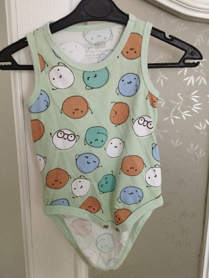 Pamuklu, kolsuz, yuvarlak yakalı erkek bebek body. Düğmeli, pastel yeşil tonlarında renkli tie-dye desenli.