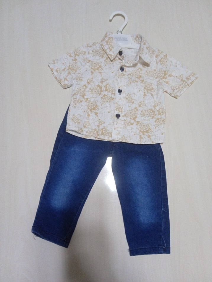 Beyaz bağlama desenli kısa kollu, düğmeli ve kesimli yakalı gömlek ile açık mavi kot pantolondan oluşan bebek erkek kıyafeti.