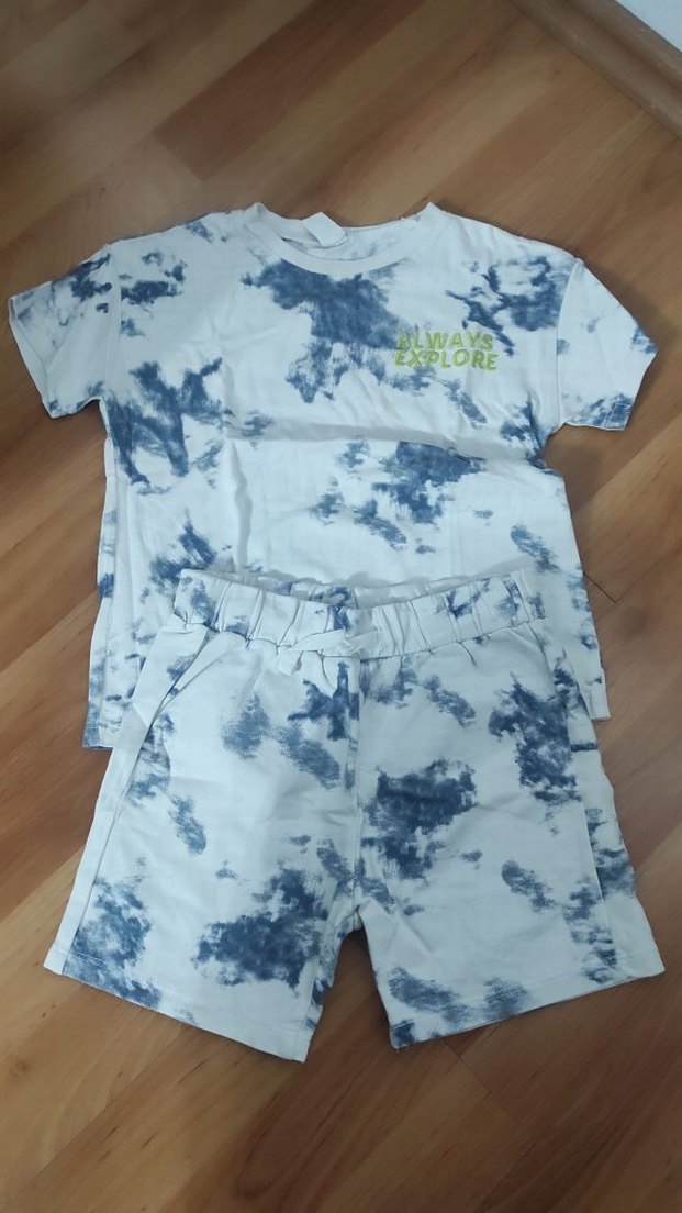 Pamuklu kumaştan üretilmiş, gri beyaz batik desenli kısa kollu bisiklet yaka üst ve şorttan oluşan erkek bebek takımı. Üstte "Always Explore" yazısı bulunur. 4 yaş