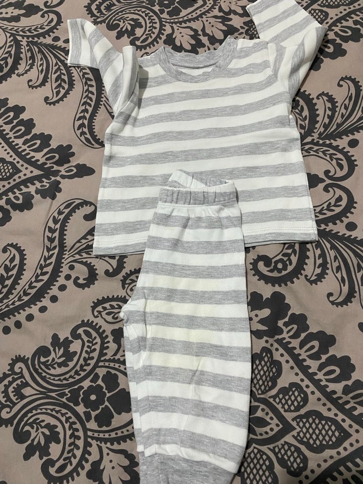 Gri beyaz çizgili, pamuklu ve örgü dokulu kısa kollu, yuvarlak yaka bebek erkek takımı. Rahat ve şık.