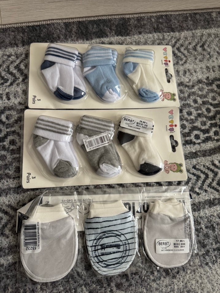 Gri ve mavi tonlarında, desenli ve yumuşak kumaşlı erkek bebek çorapları. Her sette üç çift, rahat manşetli.