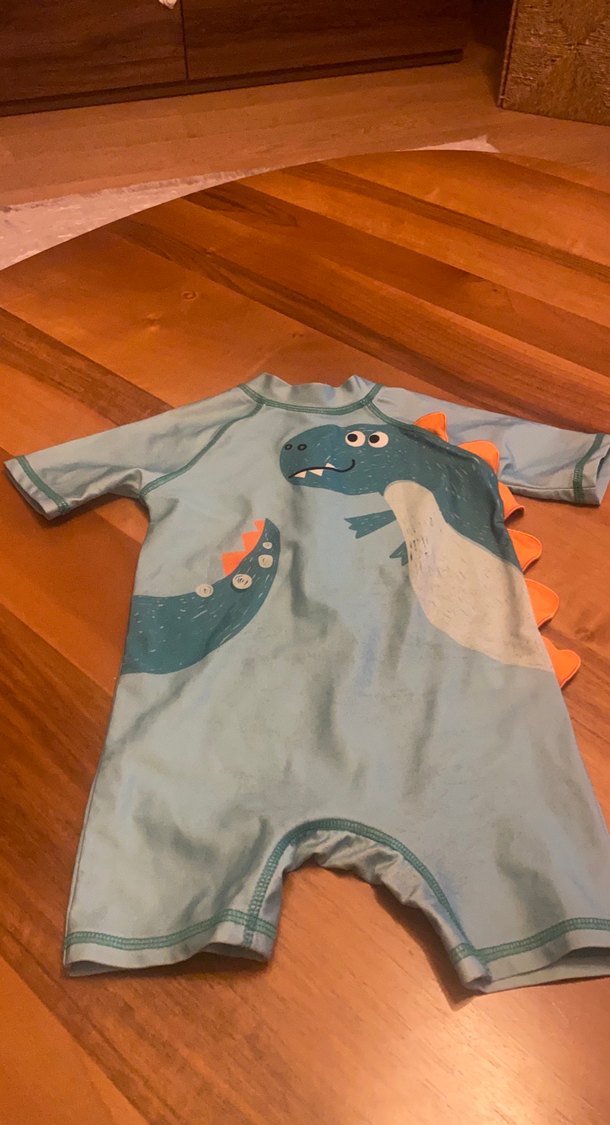 Gri renkte, kısa kollu, sırtında turuncu 3D dikenli dinozor baskılı, yumuşak ve rahat kumaştan erkek bebek mayo