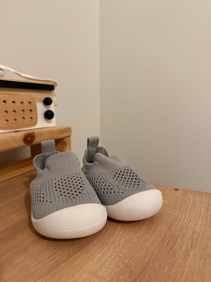 Gri örgü dokulu, kaymaz kauçuk tabanlı erkek bebek ilk adım ayakkabısı, rahat ve kolay giyilir. Küçük geldiği için satıyorum