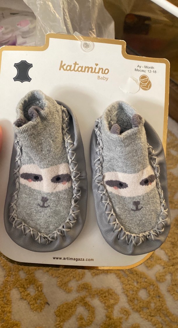Gri örgü kumaştan, nakış detaylı erkek bebek ev terliği, yumuşak tabanlı ve sıcak tutar.