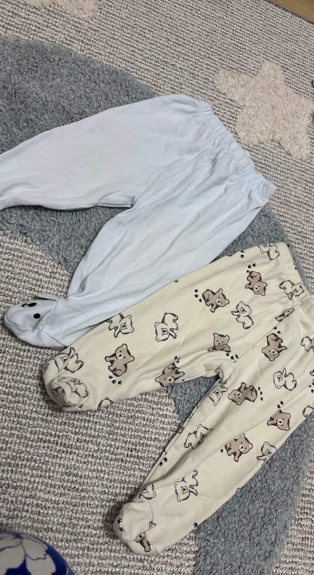 Erkek bebekler için bol kesim, yumuşak örme kumaştan yapılmış pijama altları. Bir çift düz gri, diğer çift hayvan desenli. Her ikisi de konfor için lastikli bel bantlı.