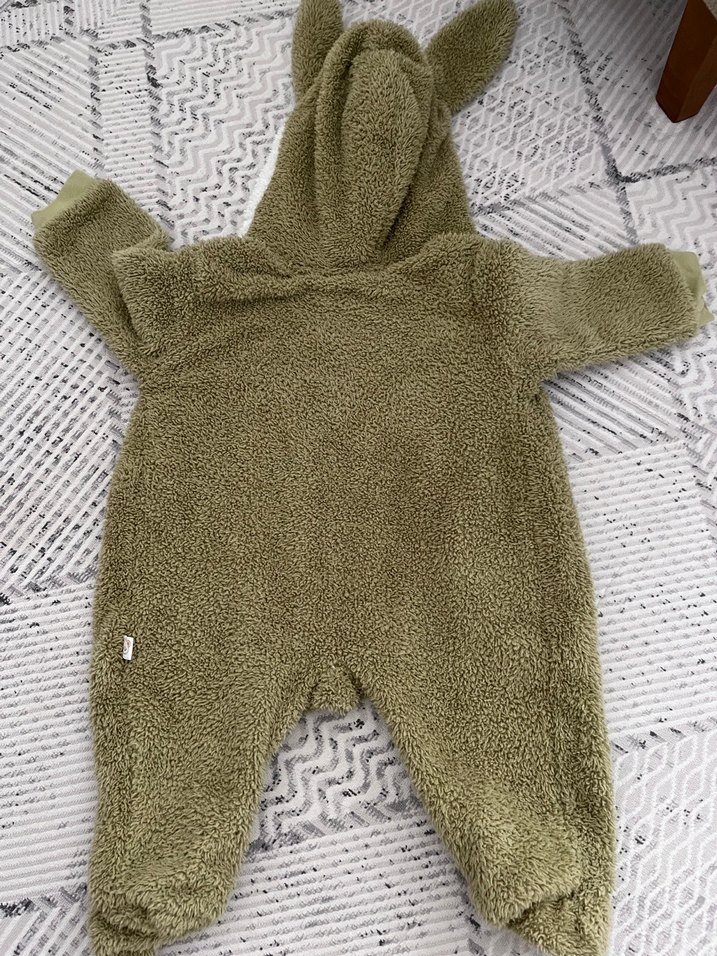 Yumuşak ve sıcak gri triko polar erkek bebek tulumu, kulaklı kapüşon detaylıdır. Bebekleri sıcak tutmak için uygundur.