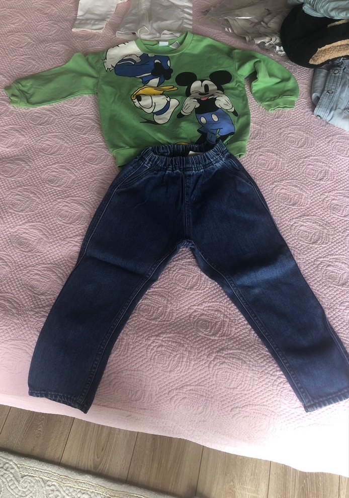 H&m markadır. 2-3 yaştır. yeşil uzun kollu sweatshirt mickey mouse baskılıdır. sade koyu denim pantolon beli ayarlanabilir. 2-3 kez kullanıldı.