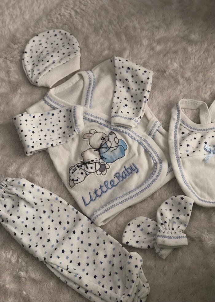 Yenidoğan erkek bebek hastane çıkışı 5 set ( şapka alt üst takım eldiven önlük )