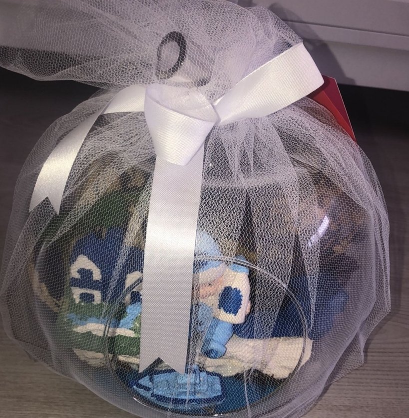 Mavi renkte biberonlu bebek tül ve kurdele ile paketlenmiştir .