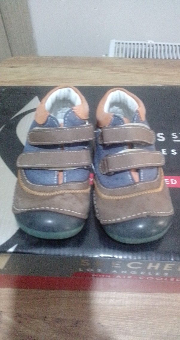 Kahverengi ve gri renklerde, tokalı, kauçuk malzemeden yapılmış erkek bebek ilk adım ayakkabısı. Sokak tarzı için uygundur.
