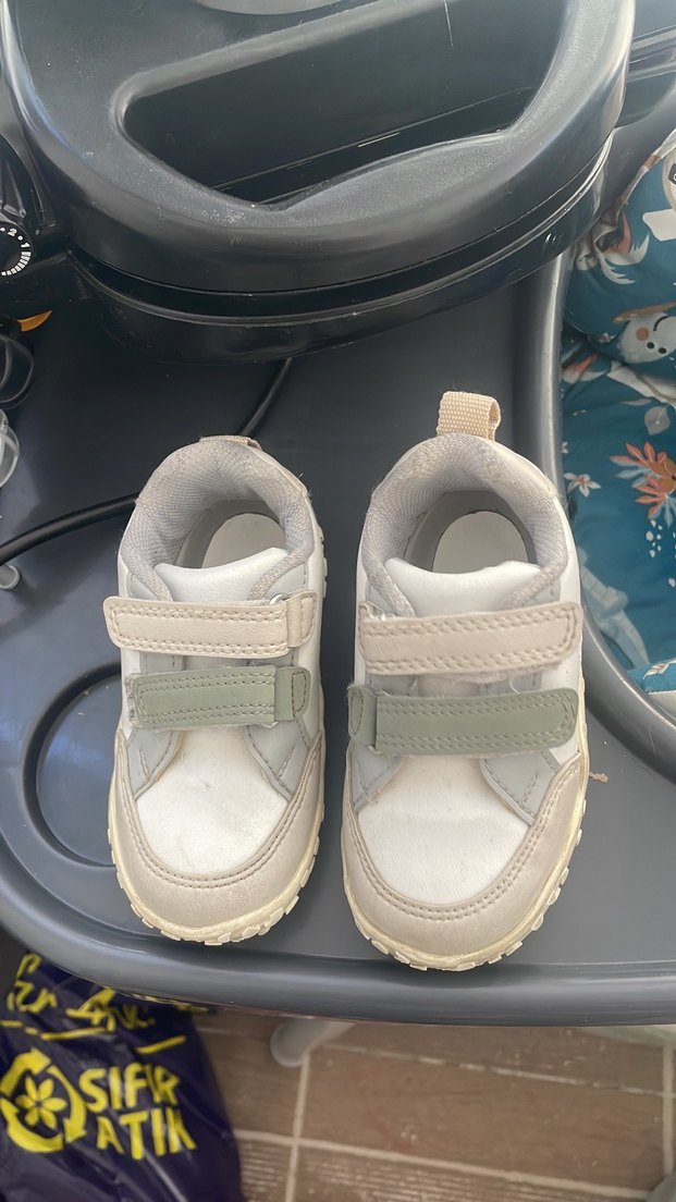 Beyaz ve gri renklerde, cırtlı bantlı ve kauçuk tabanlı erkek bebek ilk adım ayakkabısı. Rahat ve kolay giyilir. 5 6 kez kullanıldı yırtık falan yoktur temiz görüldüğü gibidir