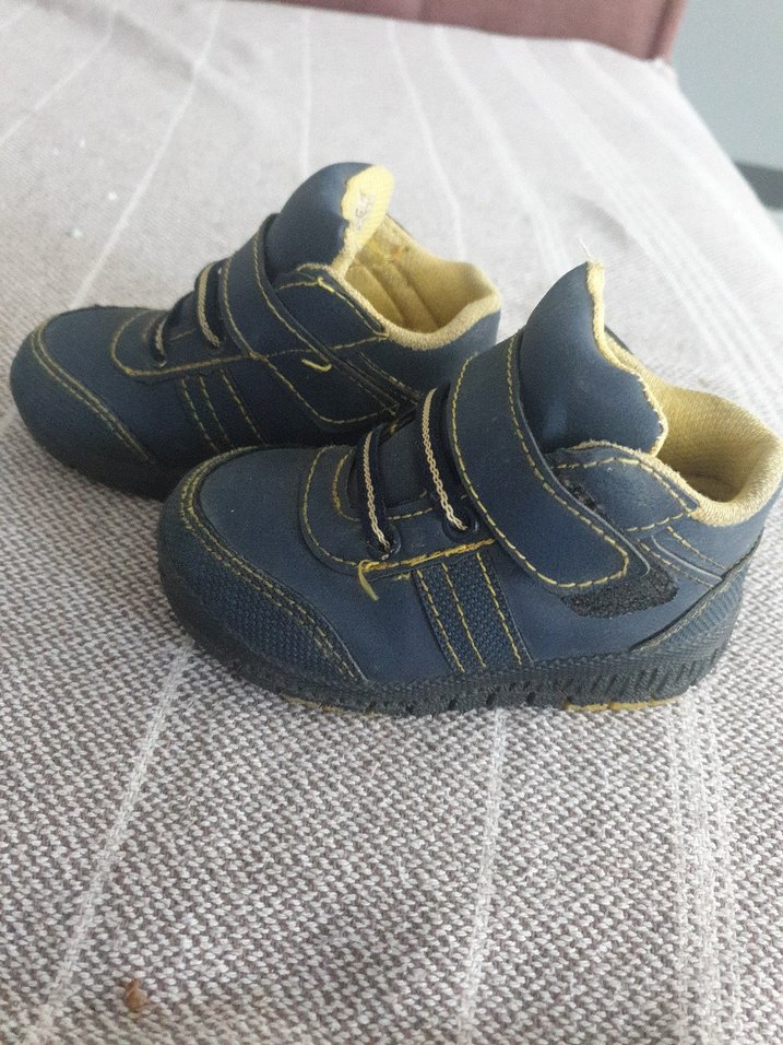 Mavi ve gri renklerde, cırt cırtlı ve kauçuk tabanlı erkek bebek ilk adım ayakkabısı, rahat ve günlük sokak stili için uygundur.