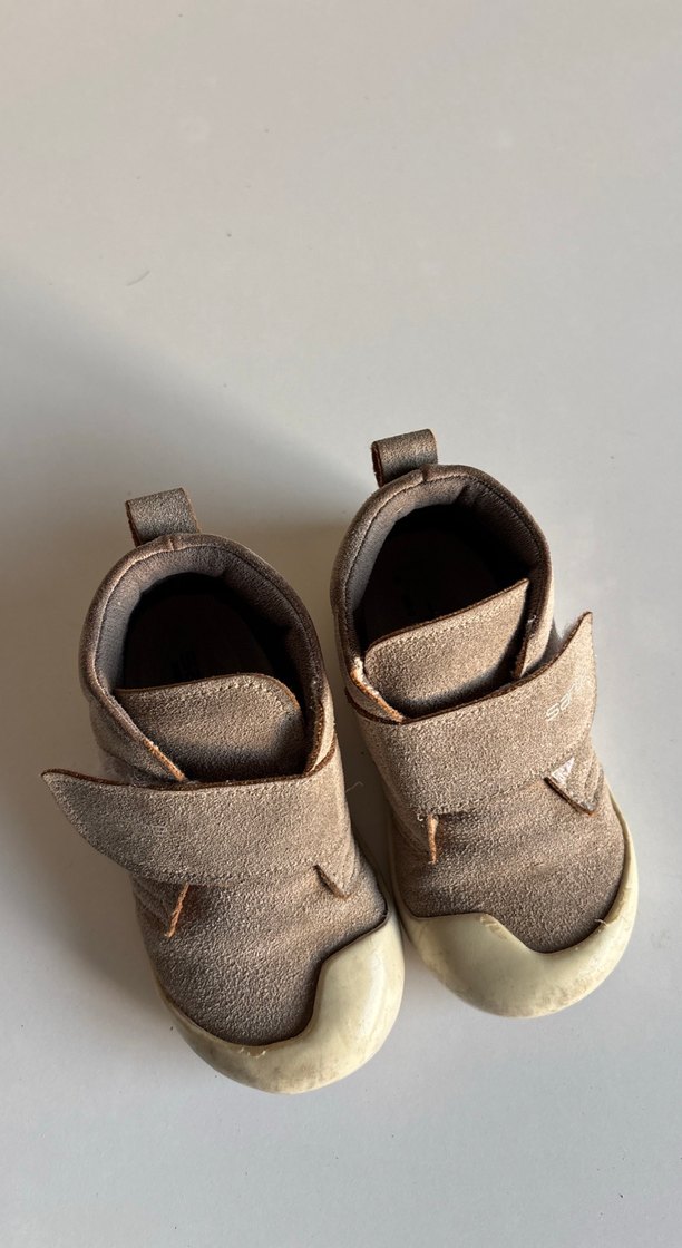 Kahverengi süet erkek kız bebek ilk adım ayakkabısı, velcro kapanışlı, trend sokak stili için uygun. Yumuşak ve rahat, ilk adımlar için ideal.