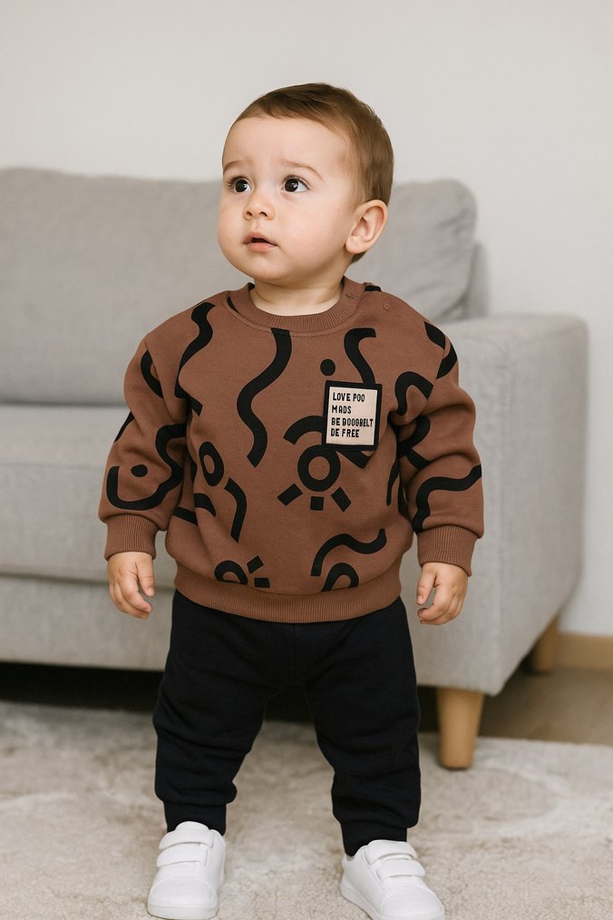 Koyu kahverengi, baskılı desenli, yumuşak ve sıcak kumaştan üretilmiş, bol kesim erkek bebek sweatshirt. Trendy ve rahat sokak giyimi için uygun.