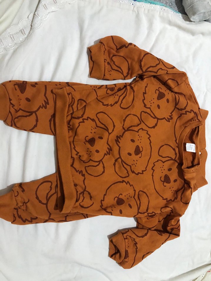 Hediye geldi giyilmedi. Kahverengi, uzun kollu ve bisiklet yaka erkek bebek takımı, yumuşak ve sıcak örme kumaştan, renkli baskılı ayı desenlidir.