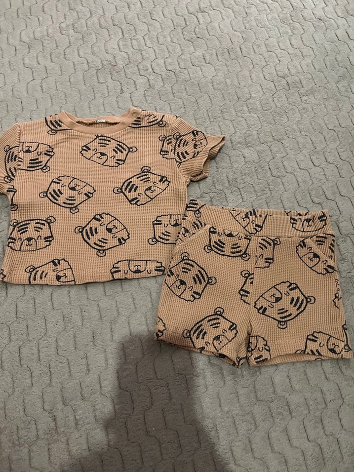 Kahverengi triko kısa kollu üst ve baskılı şorttan oluşan erkek bebek takımı, bisiklet yaka ve sokak tarzı sunar.