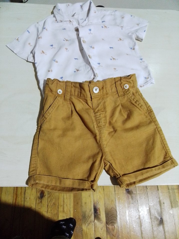 Kısa kollu, düğmeli, yakalı gömlek ve kahverengi pamuklu şorttan oluşan erkek bebek takımı. Pastel tonlarda, rahat sokak stili için uygundur.
