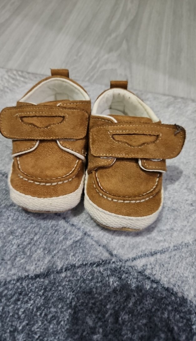 Kahverengi süet erkek bebek ilk adım ayakkabısı, tokalı, trend sokak tarzı için uygun. Yumuşak malzeme ve desensiz tasarım.