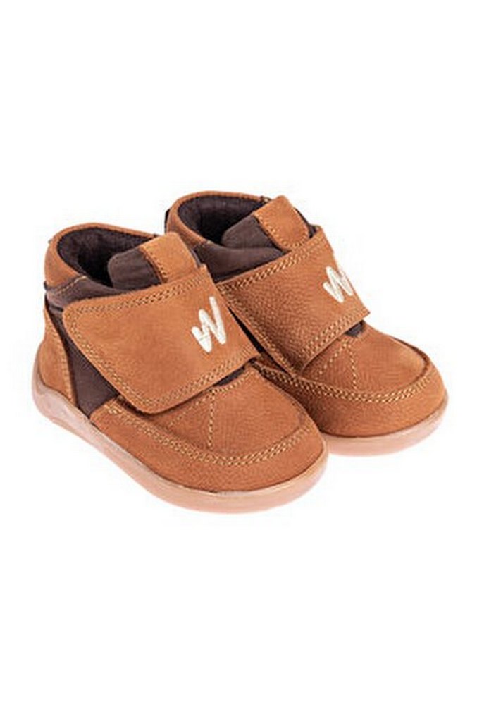 E Bebek Markası . Erkek bebekler için koyu kahverengi süet malzemeden, kolay giyilen cırt cırtlı ilk adım ayakkabısı. Rahat ve destekleyici sokak stili.