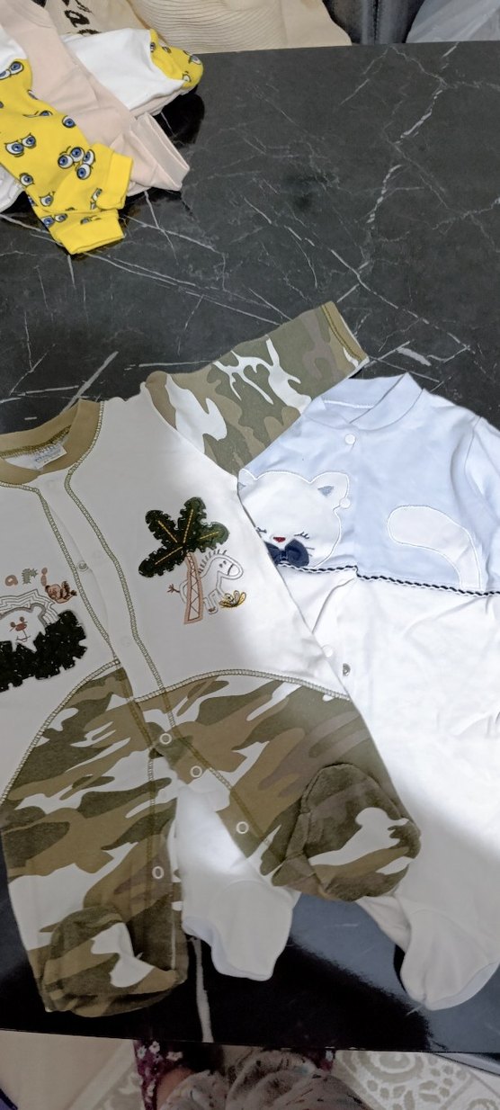 , yuvarlak yakalı, düğmeli ve pastel kamuflaj desenli erkek bebek tulumu. Rahat uyku için yumuşak kumaştan üretilmiştir.