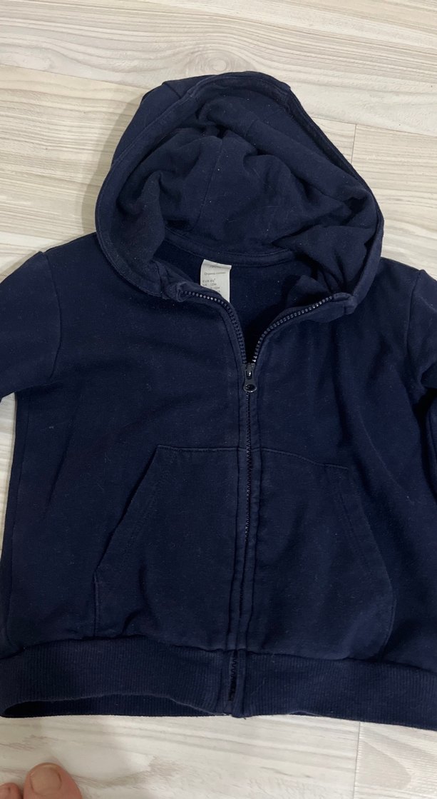 Erkek bebek için kapüşonlu ve fermuarlı sweatshirt. Yumuşak, sıcak tutan kumaş, uzun kollu ve fitted kesim. Koyu mavi, sade ve desensiz tasarım.