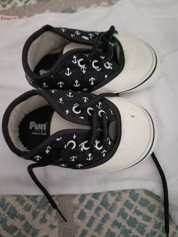 Gri ve beyaz renklerde, çapa desenli, kaydırmaz tabanlı ve cırt cırtlı erkek bebek ilk adım ayakkabısı, rahat sokak stili için uygun.