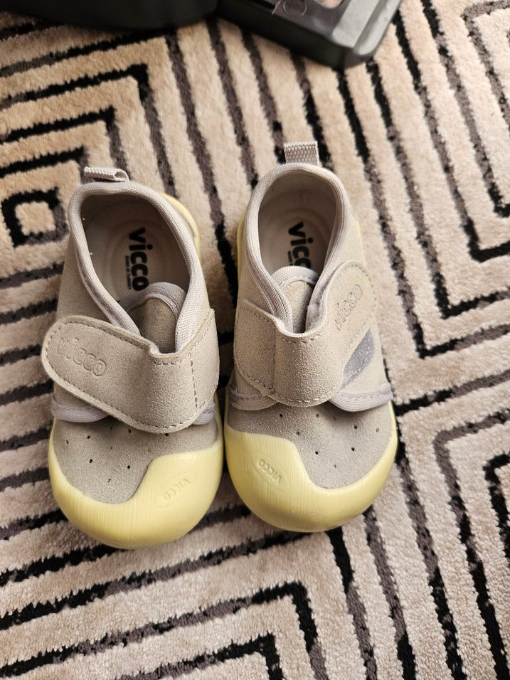 Vicco markalı, kaymaz tabanlı, cırt cırtlı erkek bebek ilk adım ayakkabısı. Gri ve sarı yılan desenli, rahat sokak stili için uygun.