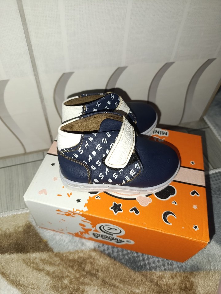 Kaydırmaz tabanlı, renkli baskılı mavi erkek bebek ilk adım ayakkabısı, kolay kullanım için cırt cırtlıdır.