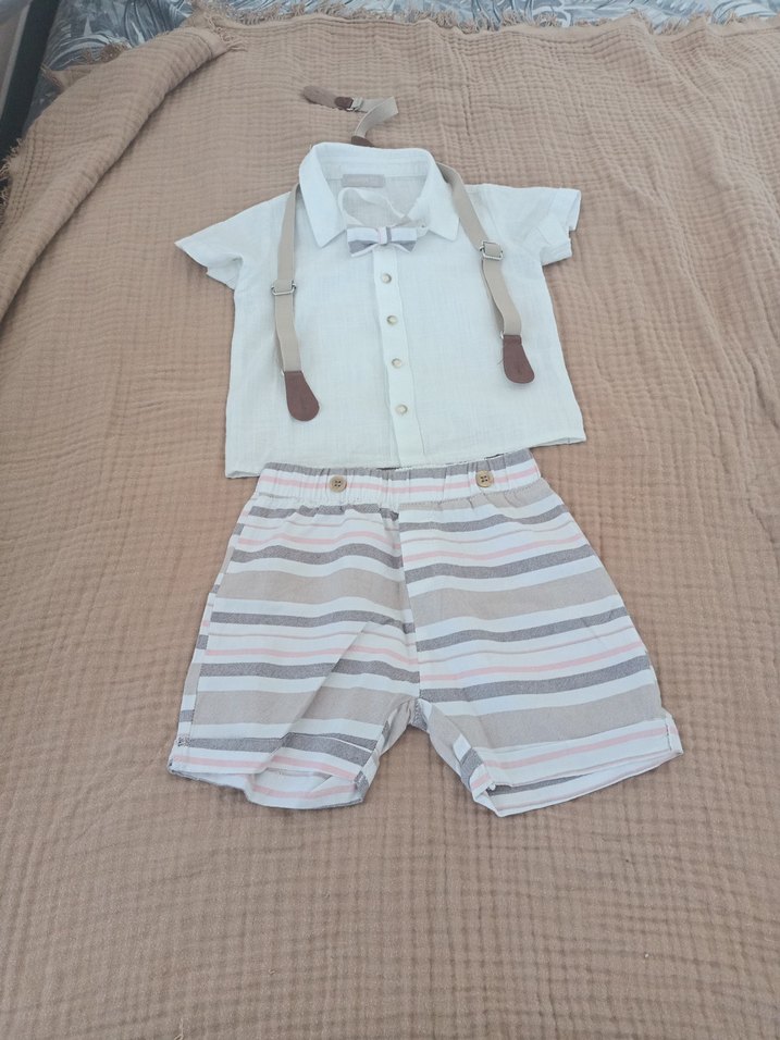 Bej pastel renkli, kısa kollu, düğmeli ve yakası kesik erkek bebek takımı. Pamuk kumaş, çizgili şort ve askı detaylı.