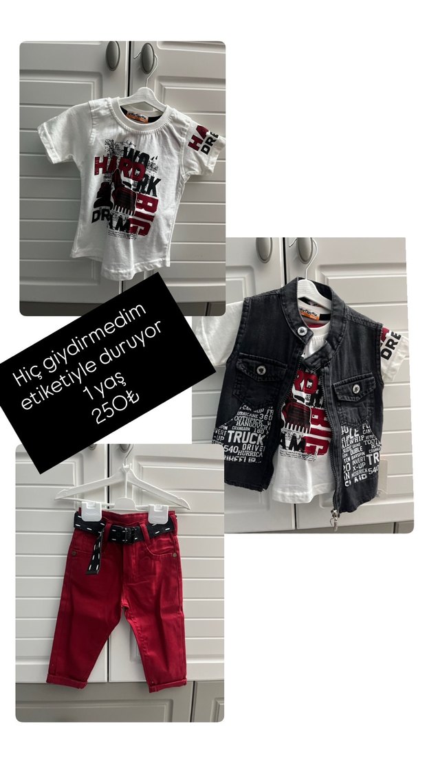 Baskılı kısa kollu tişört, koyu renk kot yelek ve kemerli kırmızı pantolondan oluşan 3 parçalı erkek bebek takımı. 1 yaş için uygundur.