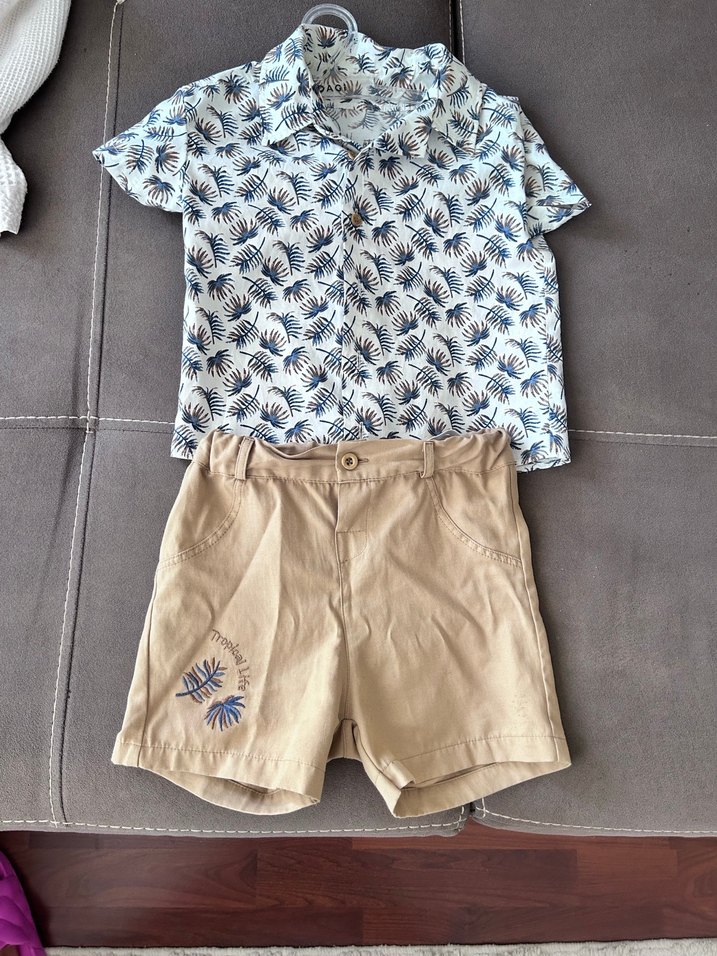 Ebebekten alındı.Kısa kollu, baskılı gömlek ve kahverengi pamuk şorttan oluşan erkek bebek takımı. Gömlek düğmeli ve yakası notched lapel.