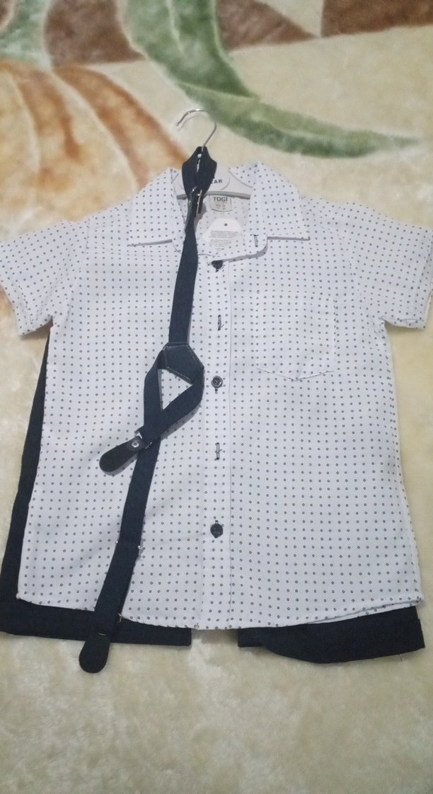 Beyaz ve gri tonlarda, baskılı kısa kollu, halter yaka ve kemerli gömlek ile koyu renk şorttan oluşan erkek bebek sokak stili takım.