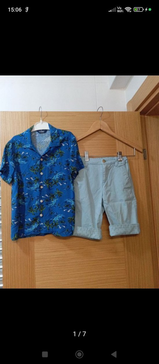 Mavi kısa kollu, düğmeli, yaka detaylı gömlek ve gri denim şort içeren erkek bebek takımı. Gömlek batik desenlidir, sokak stili için uygun.