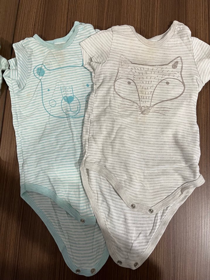 Üç adet pastel renkli, kısa kollu ve yuvarlak yakalı pamuklu erkek bebek body. Biri ayı, diğeri tilki desenli, alt kısmında çıtçıtlar bulunur.