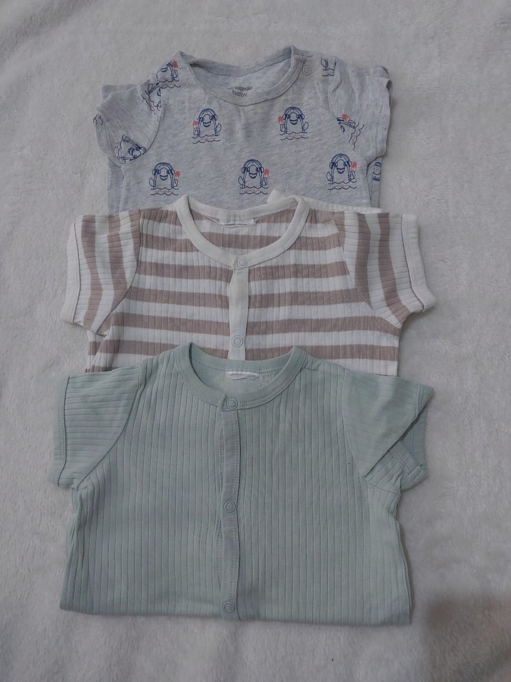kısa kollu ve düğmeli üçlü bebek erkek body seti. Pamuklu yumuşak kumaştan, rahat ve kullanışlıdır. 3-6 ay.