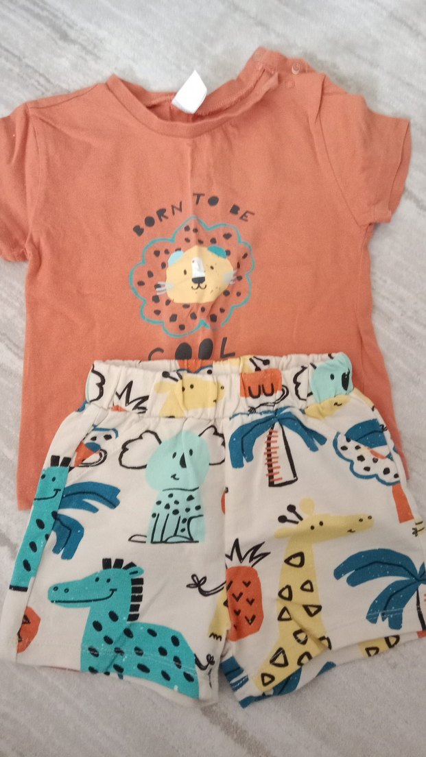 Erkek bebek için pamuklu, kısa kollu, aslan baskılı pastel kahverengi üst ve hayvan desenli şort içeren sokak stili takım.