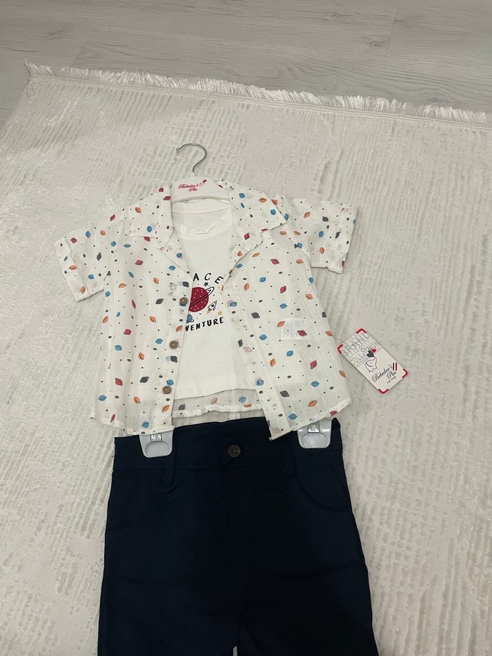 Erkek bebek için düğmeli, kısa kollu, baskılı beyaz gömlek ve koyu renk pantolonlu pamuklu takım. Rahat ve şık.
