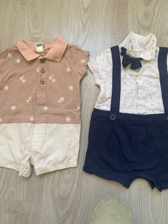 Kısa kollu, pamuklu erkek bebek tulum seti. Düğmeli ve kesik yaka detaylı, pastel renklerde ve sade normcore tarzında.