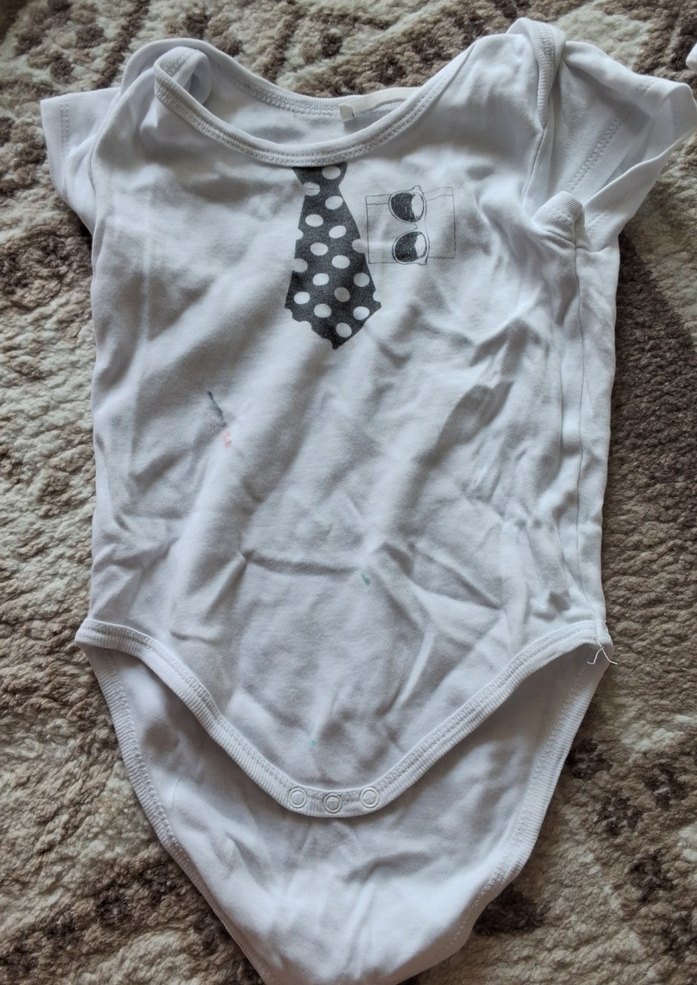 Pamuk kumaştan, düğmeli, kısa kollu ve polo yakalı erkek bebek body. Beyaz renkte, gri kravat ve güneş gözlüğü baskılı, sokak stiline uygun. hafif lekesi mevcuttur