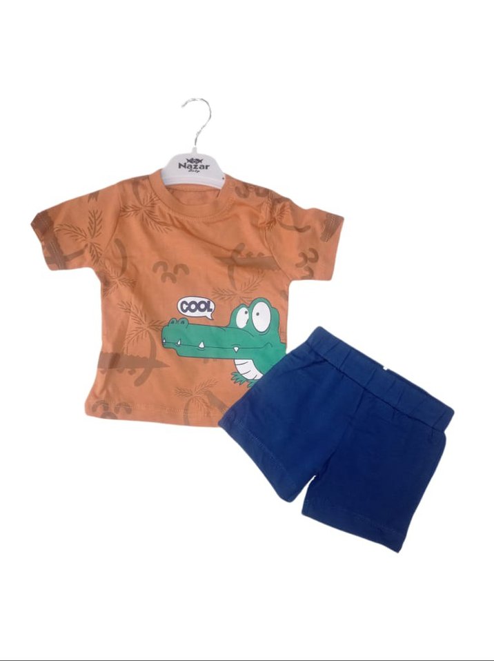 9 Ay 1,5 Yaş 2 Yaş beden seçenekleri mevcuttur. Kremit-Lacivert renkli takım Kısa kollu, yuvarlak yakalı, renkli timsah desenli pamuklu üst ve şorttan oluşan erkek bebek takımı.