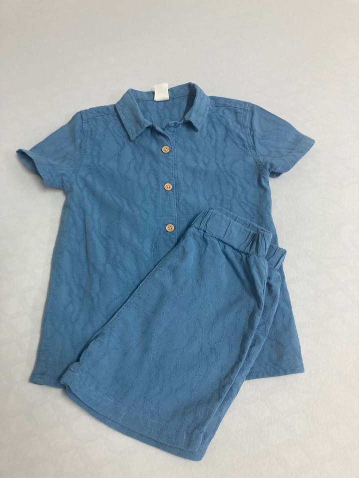 Pastel mavi renkte, keten kumaştan kısa kollu ve yaka detaylı erkek bebek takımı. Düğmeli gömlek ve şorttan oluşur, sokak stiline uygundur.