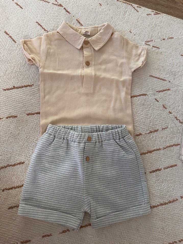 Krem renkli, düğmeli ve yakalı kısa kollu pamuklu üst ile çizgili, lastikli bel şort. Bebekler için yumuşak ve rahat. Sıfır